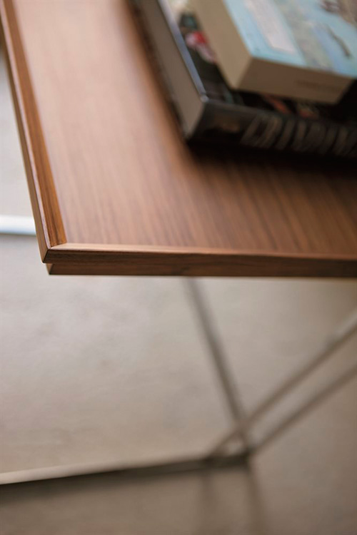 La taula es caracteritza per incorporar una safata en fusta de noguera canaletta, separable i una estructura en metall de la base que la sosté.