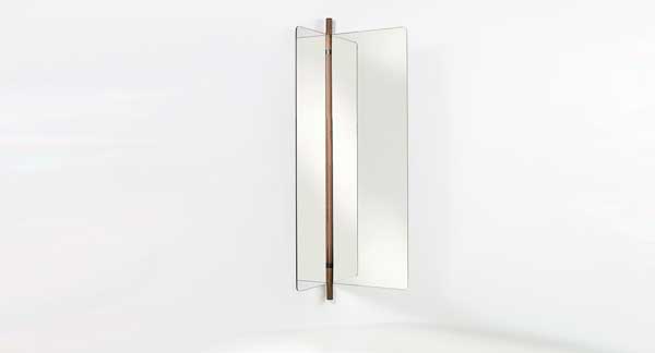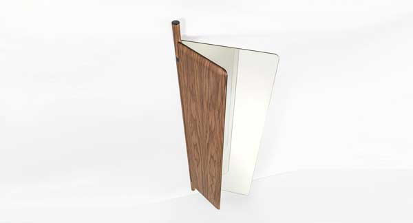L’estructura del mirall es presenta en fusta massissa de noguera canaletta i incorpora dos suports abatibles, permetent així múltiples opcions de configuració. L’ eix central es presenta també en fusta massissa de noguera amb detalls metàl·lics.