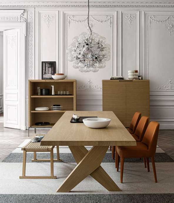 La taula destaca per la seva espectacular base en fusta massissa en forma de X. El taulell es caracteritza per la seva rigidesa i per la seva forma rectangular, i està disponible en diversos tipus de fusta.