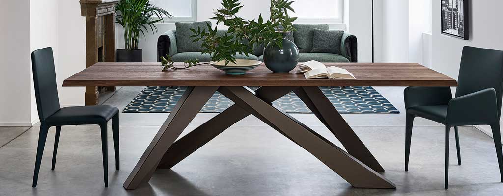 Big Table de la firma italiana Bonaldo, es una espectacular taula d’estil contemporani que es caracteritza per la inclinació de les seves potes i per un taulell de línies fines i lineals.