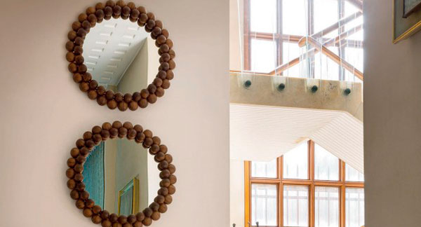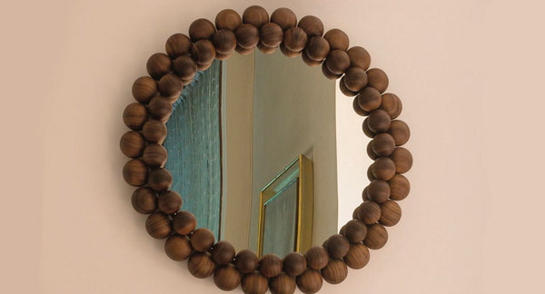 La estructura del espejo está formada por sesenta esferas de madera de nogal que recuerdan al aspecto de una perla.