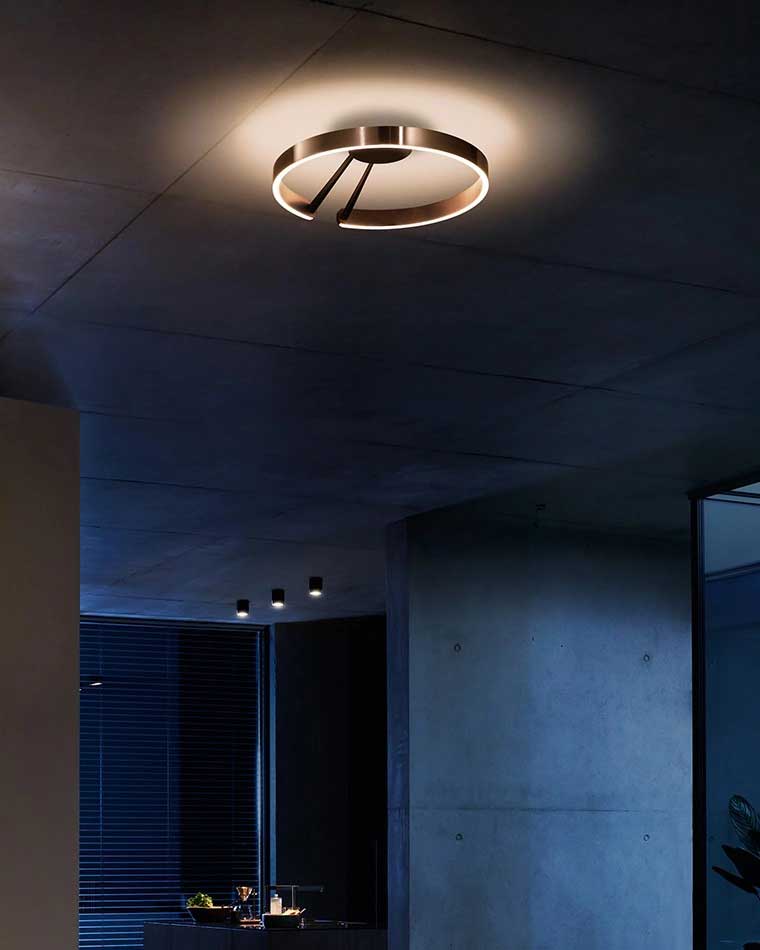 La lámpara es perfectamente reconocible por su corte característico en la luminaria circular, que le otorga un aspecto incomparable. Gracias a su innovadora tecnología en el flujo de luz, la colección permite dirigir la luminaria como por arte de magia.