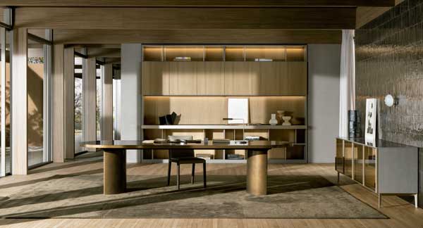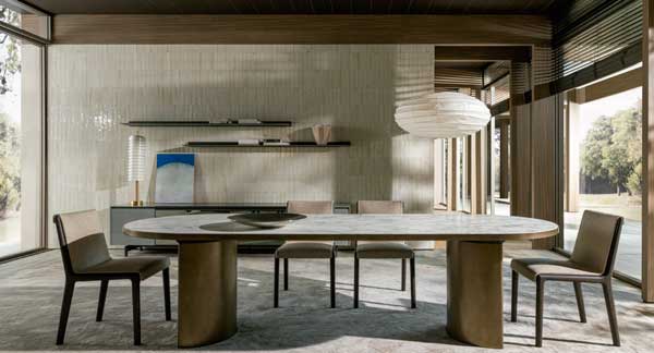 Molteni & C incorpora a su colección Heritage una espectacular pieza contemporánea que destaca por su forma alargada y por su tablero de madera maciza, sostenido por dos espectaculares pilares con forma semicircular.