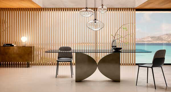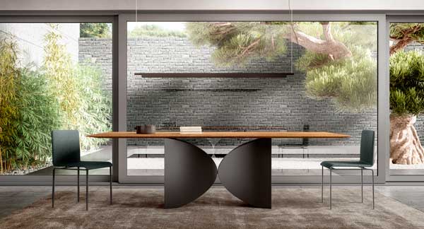 Se trata de una mesa imponente que juega con el equilibrio entre las líneas ligeras y sutiles del tablero y la contundencia de su base.