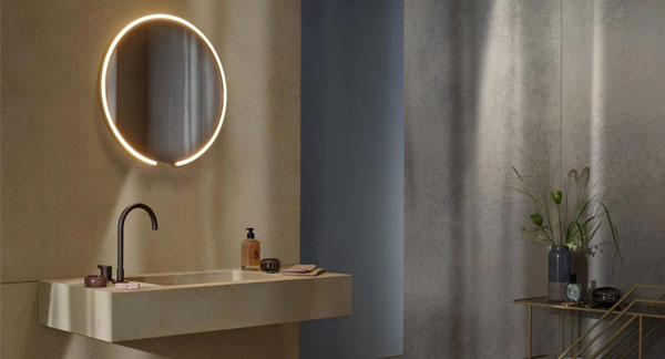 Disponible en versiones de 40 y 60 cm de diámetro, es una pieza funcional y escultural que añade carácter a vestidores, baños o zonas de tocador contemporáneas.