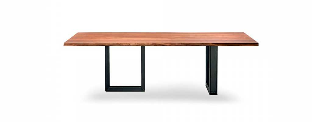 Se trata de una pieza elegante y exclusiva, que destaca por su resistente base en metal barnizado transparente. El tablero se presenta en madera de roble ahumado o de roble natural con bordes irregulares.