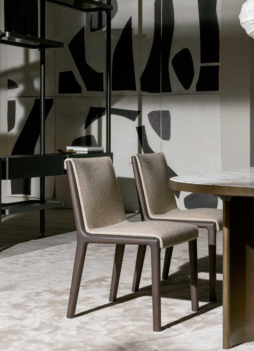 Como el resto de colecciones de la firma italiana, la silla Janet está disponible en un amplio abanico de opciones de tejidos y pieles.