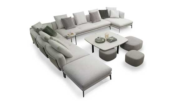 Se trata de un sofá versátil y polivalente, que gracias a sus múltiples opciones de configuración aporta soluciones funcionales y elegantes para cualquier tipo de espacio de la zona de día.