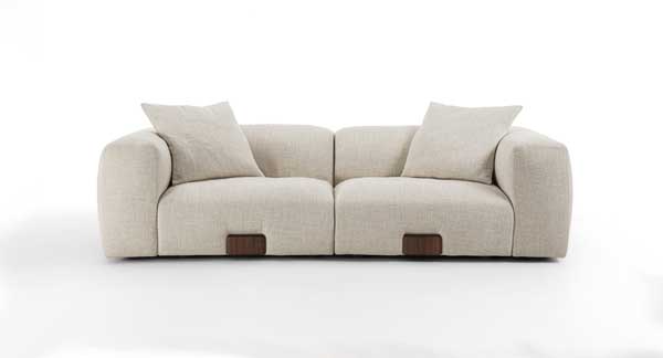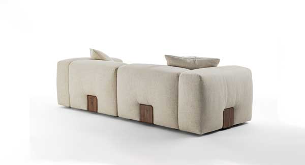 Uno de sus rasgos más distintivos es el perfil de madera maciza que rodea la base de cada módulo. Este detalle, elaborado con la excelencia técnica característica de Porada, aporta calidez y realza la suavidad del tapizado, generando un equilibrio visual entre estructura y confort.