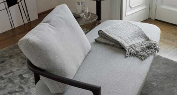 La estructura principal del sofá se presenta en madera de fresno macizo, y está disponible en una gran variedad de telas y acabados. Los cojines del respaldo se caracterizan por su confortable estructura rellena de plumas, que garantiza la máxima comodidad.