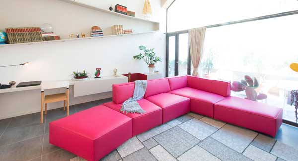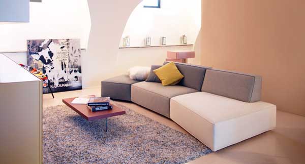 El sofá Slide de la firma italiana Lago se caracteriza por su estructura modular trapezoidal, que le otorga una estética elegante y minimalista.