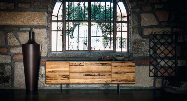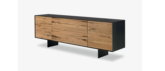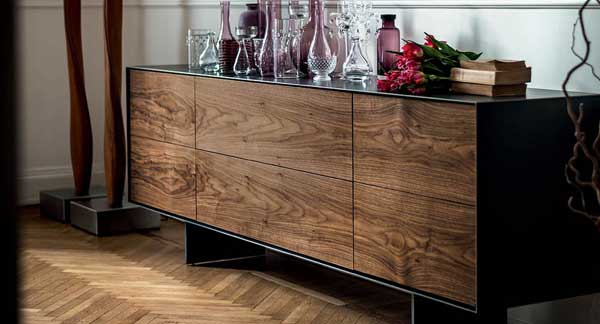 El buffet está fabricado en madera maciza y latté chapado, lo que asegura una estructura robusta y duradera, además de una apariencia elegante y atemporal. Su diseño destaca por el marco, que puede ser de acero o madera, proporcionando dos opciones estéticas según el estilo deseado.