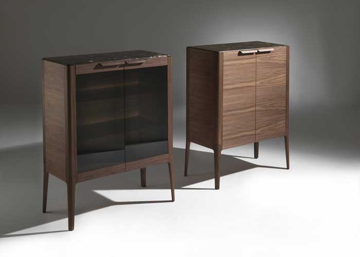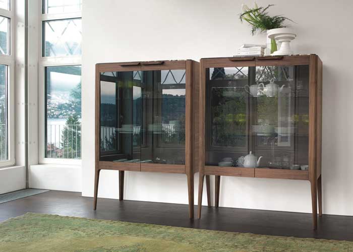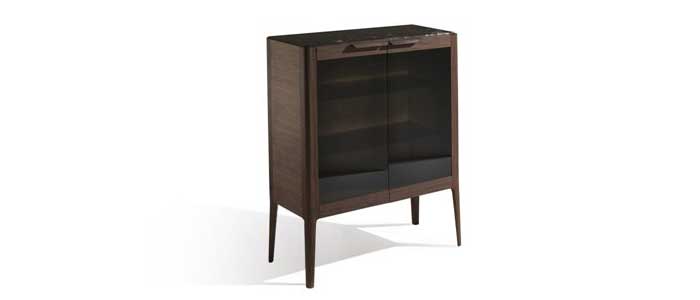 Aparador en nogal canalettacon dos puertas en cristal ahumado y tapa de mármol, madera o en cristal al ácido retrobarnizado. Estantes interiores en cristal.