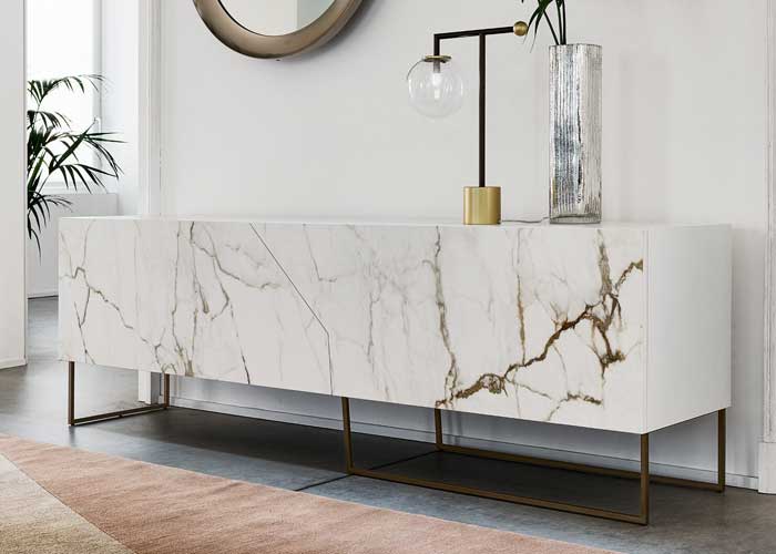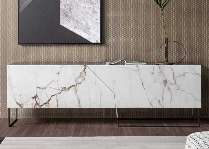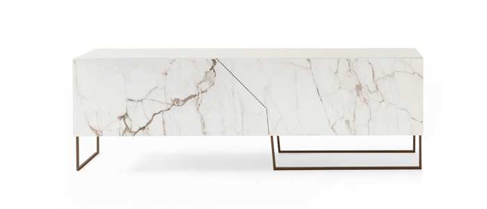 Los aparadores Doppler están inspirados en la idea de la ilusión de superficies superpuestas, mientras que en realidad las puertas están formadas por una sola superficie: de hecho, es la combinación de diferentes patrones gráficos con colores brillantes lo que crea este efecto óptico particular. La apertura asimétrica de las puertas representa un signo adicional de originalidad. La estructura de madera lacada se apoya en una base de madera maciza.
