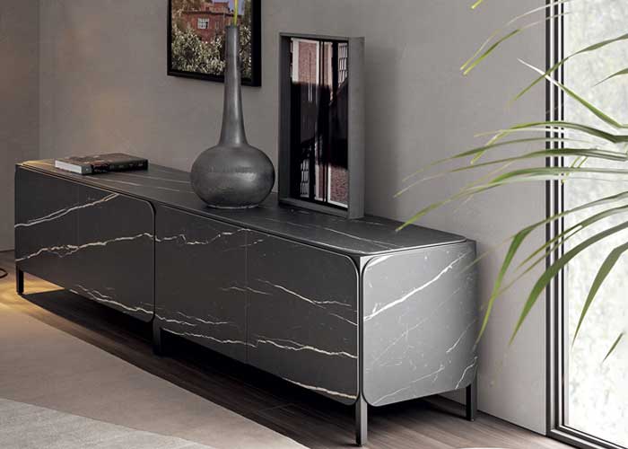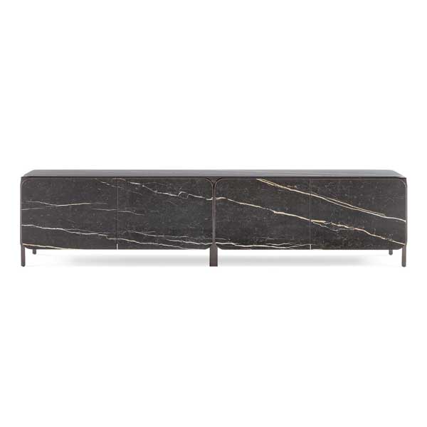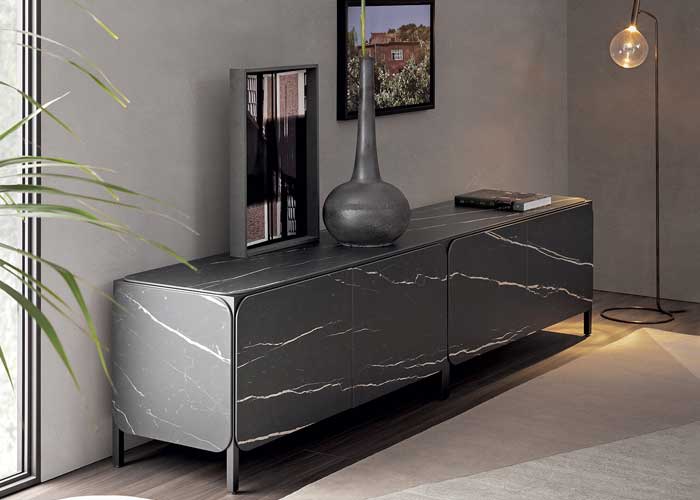 Una estructura metálica, que le da el nombre al aparador («frame «en inglés significa marco, estructura), paneles laterales y tablero de cerámica insertados en la estructura: la colección Frame representa una forma sin duda alternativa de diseñar un aparador.El aparador se caracteriza por las esquinas redondeadas que le dan dinamismo al conjunto, dejando visible la estructura metálica, que enmarca y resalta, por el contraste del material, el tablero, las puertas y los lados de cerámica Calacatta Macchia Vecchia o Laurent.