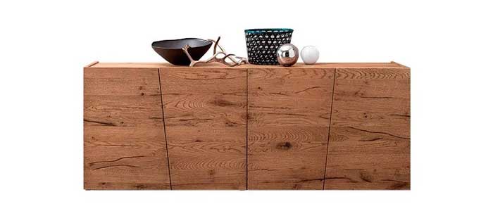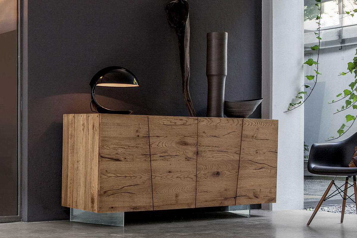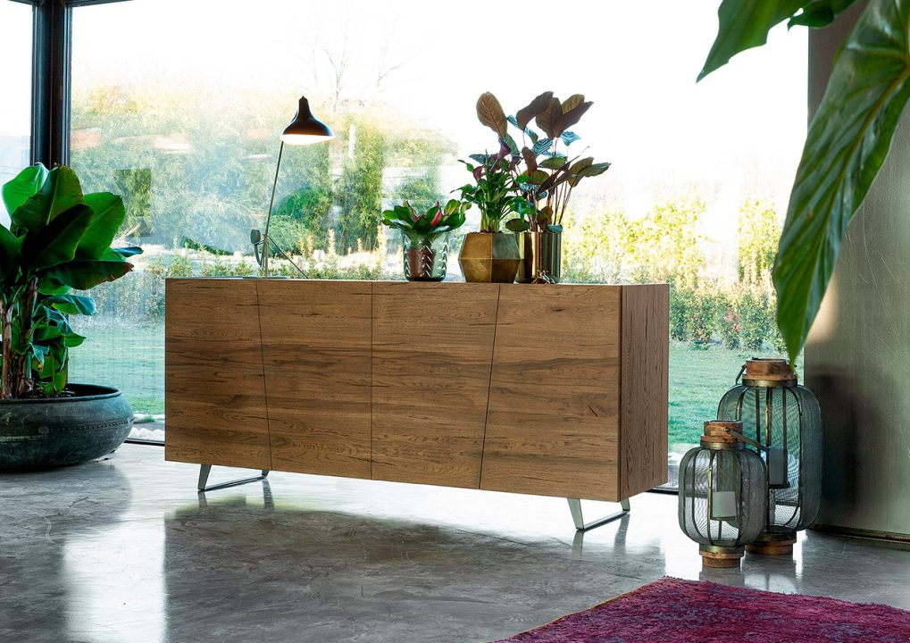 Punto de contacto: el deseo de mejorar la energía de la madera. Roble 100% macizo que enseña su naturaleza con orgullo: las vetas de la madera fluyen sin interrupción para todo el frente, cruzando las líneas diagonales de las puertas. La naturalidad nunca ha sido tan moderna.