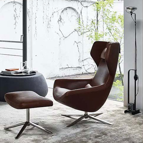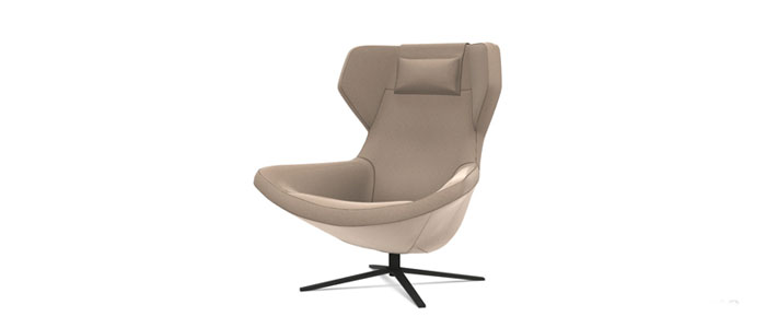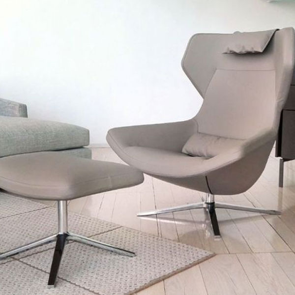 El asiento que fluye ininterrumpidamente hacia los reposabrazos es el sello distintivo de este pequeño sillón y silla de relajación. El primero, con base giratoria de aluminio y cuatro radios, combina elegancia y comodidad. Este último, que también es giratorio y tiene un otomano a juego, es más grande con un reposacabezas con imán para ajustes. Hay disponibles dos bases de aluminio, una de cuatro radios y otra circular.