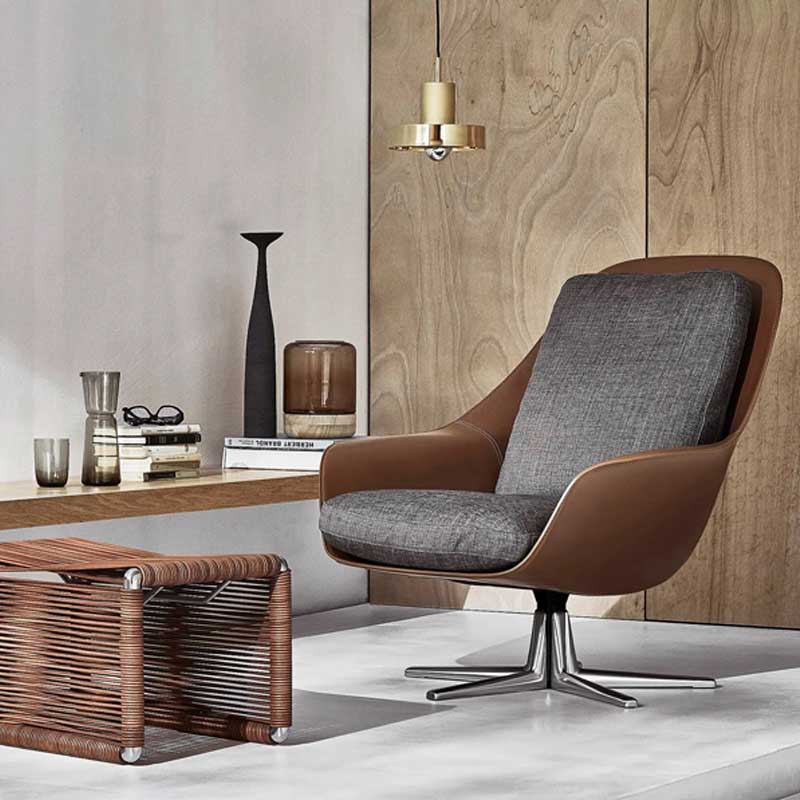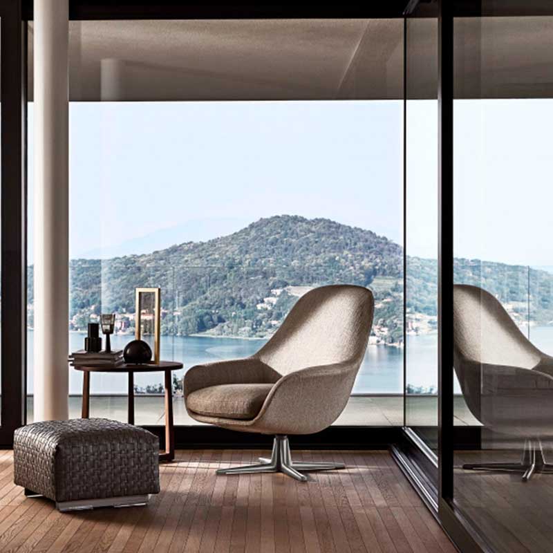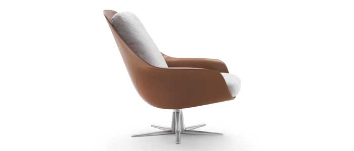 El sillón Sveva destaca por su carácter inconfundible, evidenciado en su refinada silueta que sugiere comodidad y generosidad. Su diseño incluye una estructura sinuosa de poliuretano rígido, recubierta en cuero, que envuelve los mullidos cojines del asiento y respaldo, rellenos de plumón de ganso. La base giratoria, fabricada en aluminio fundido a presión, está disponible en versiones de cuatro y cinco radios, esta última especialmente concebida para satisfacer las demandas del sector hotelero.