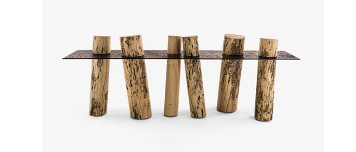 La consola Venice Briccola, diseñada por Claudio Bellini para Riva 1920, se distingue por una superficie de vidrio «stopsol» que se complementa con una estructura de postes elaborados en madera maciza de Briccola, obtenida de los antiguos postes de señalización de la Laguna de Venecia.