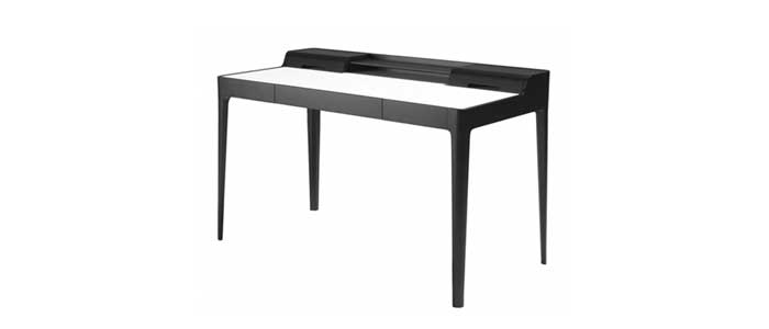 Escritorio con cajón en nogal canaletta macizo, portaobjetos y pasacables. Almohadilla o tapa en cuoietto.