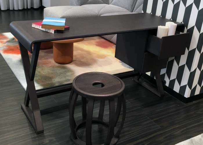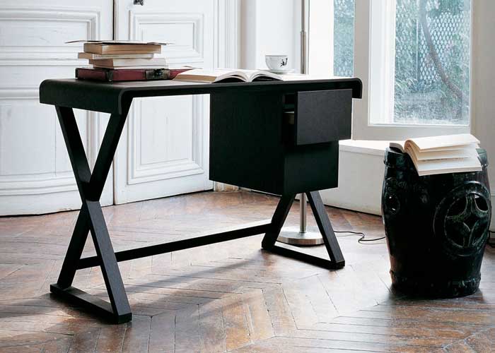 La parte superior rectangular del escritorio está forrada con cuero natural o negro o, alternativamente, con una versión superior curva. Ambos cuentan con una cubierta de acceso de cables y una cajonera colocada debajo de la parte superior.
