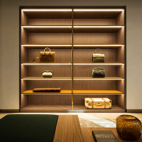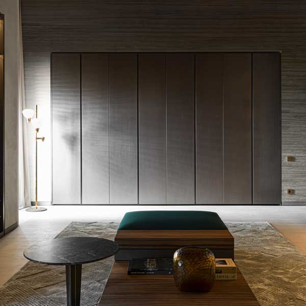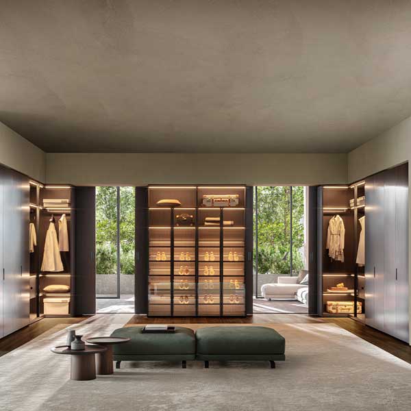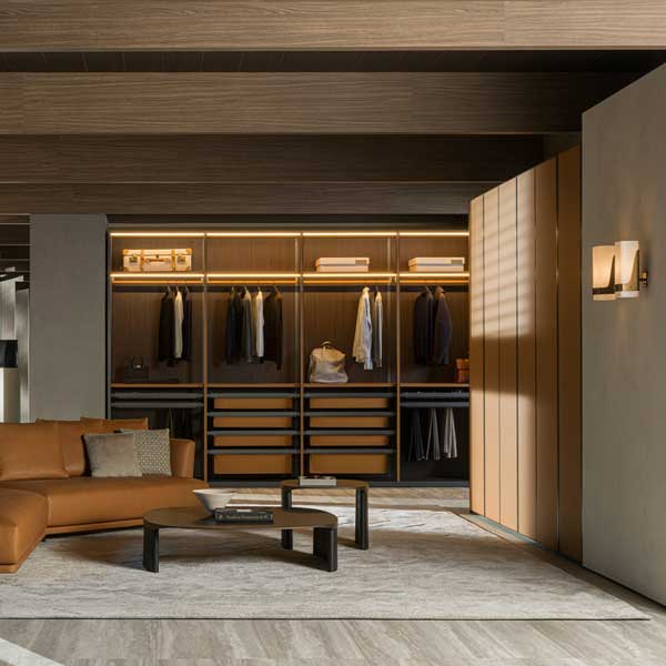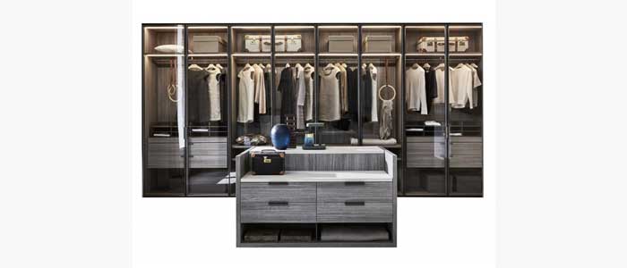 Gliss Master, en la sofisticada versión sin puertas, se transforma en un vestidor equipado, que permite soluciones lineales y angulares. Muy amplia la selección de los equipos internos, para diseñar los módulos con soluciones personalizadas según las necesidades de cada uno: cajoneras colgadas, bandejas extraibles, estantes zapateros, módulos porta-objetos y cajones equipados con divisorios son algunas de las soluciones recomendadas.