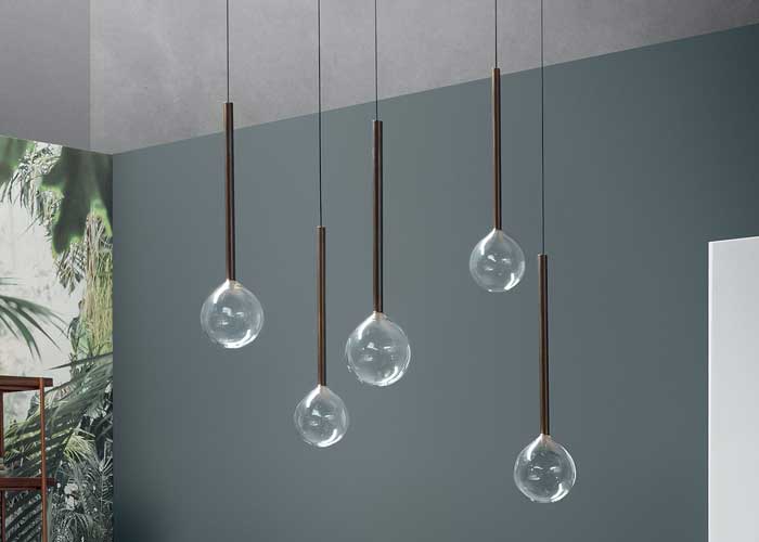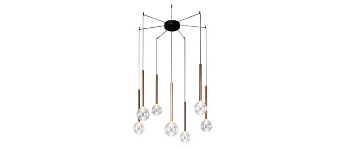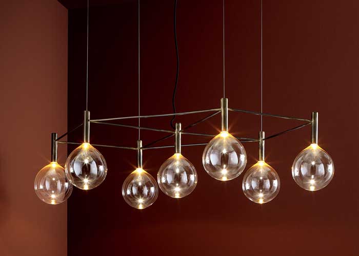 de latón bruñido que contiene la fuente de luz y recuerda la imagen de los maestros vidrieros que, en sus talleres venecianos, usan largas tubos de soplado para elaborar la