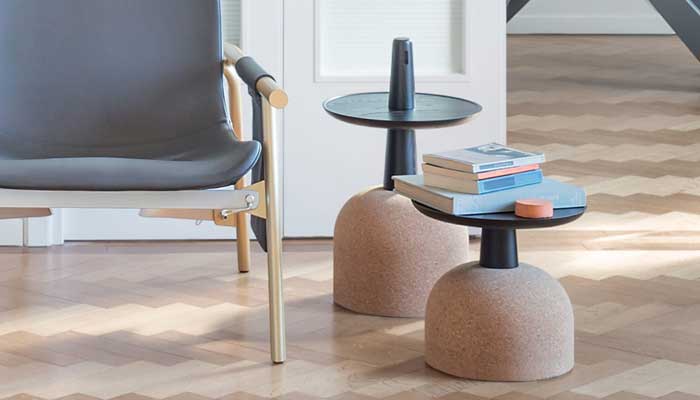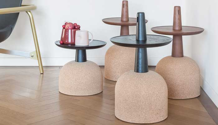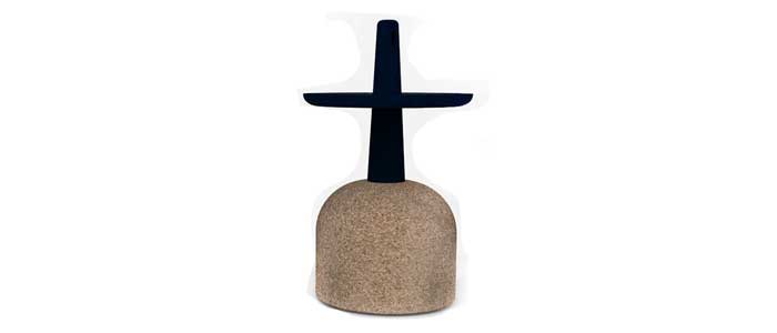 sobre todo, de materiales que normalmente no se unen, cuya percepción del peso se ve alterada: el corcho, más ligero que la madera, aquí sirve como base, por lo que aparece como el peso