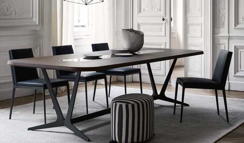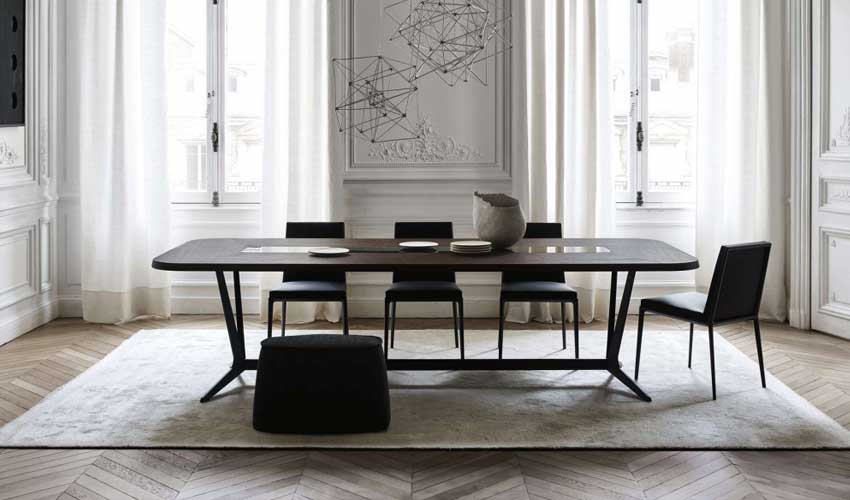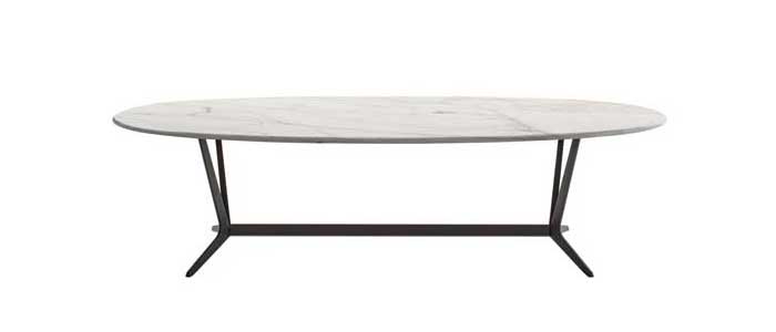 Astrum es una colección de mesas, rectangulares, redondas y ovaladas, que se distinguen por el marco base especial «caballo de sierra». La estructura está formada por un único soporte de aluminio fundido a presión con acabado pintado que, en función de la forma de la mesa, se compone de dos o tres elementos unidos por un travesaño y que forman la base-estructura de las mesas rectangulares, mientras que tres elementos unidos en el la base del anillo de acero establecen el soporte para las mesas redondas. La sección triangular del soporte, levantada del suelo con una ligera inclinación, confiere a la estructura ligereza y solidez. Los tableros de las mesas están disponibles en varios acabados de madera, lacados y mármol. Solo en las versiones redondas es posible insertar una bandeja giratoria.