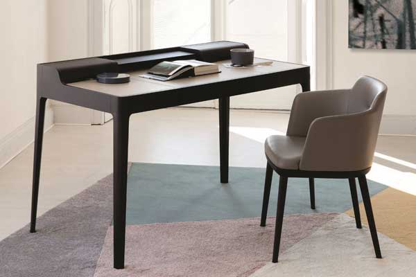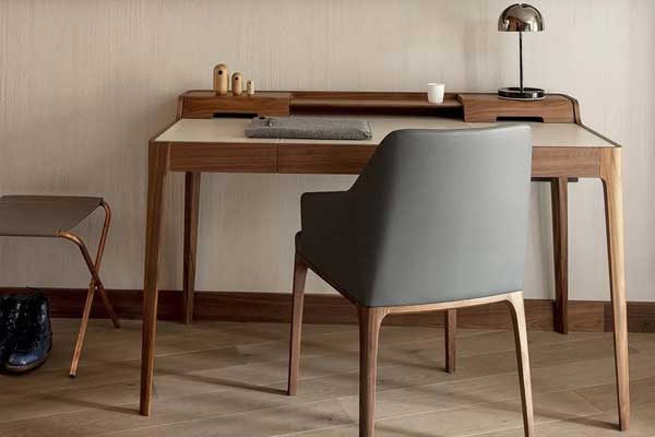 Escritorio con cajón en nogal canaletta macizo, portaobjetos y pasacables. Almohadilla o tapa en cuoietto.