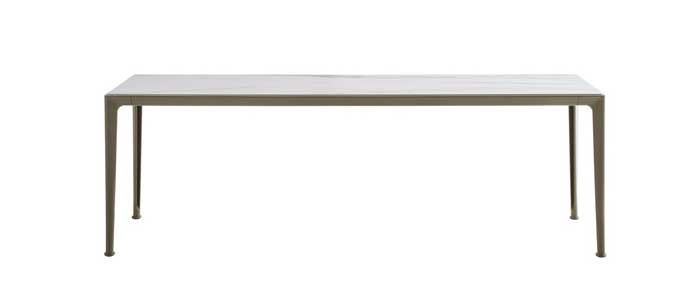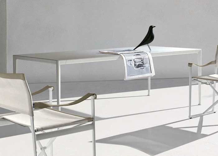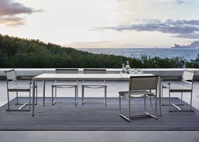 Las mesas Mirto Outdoor se caracterizan por su pureza de formas, elegancia atemporal y detalles de calidad. Disponibles en numerosos tamaños, se presentan con ligeras estructuras de aluminio inyectado y una variedad de tableros: de aluminio pintado, lamas de iroko, gres porcelánico y baldosas de piedra de lava esmaltada decoradas con reproducciones de encajes tradicionales sicilianos. Esta última versión utiliza un material especial para la decoración, obtenido rompiendo el cristal de monitores e instrumentos electrónicos desechados, y aplicándolo a la superficie de las baldosas mediante un exclusivo proceso de fabricación.