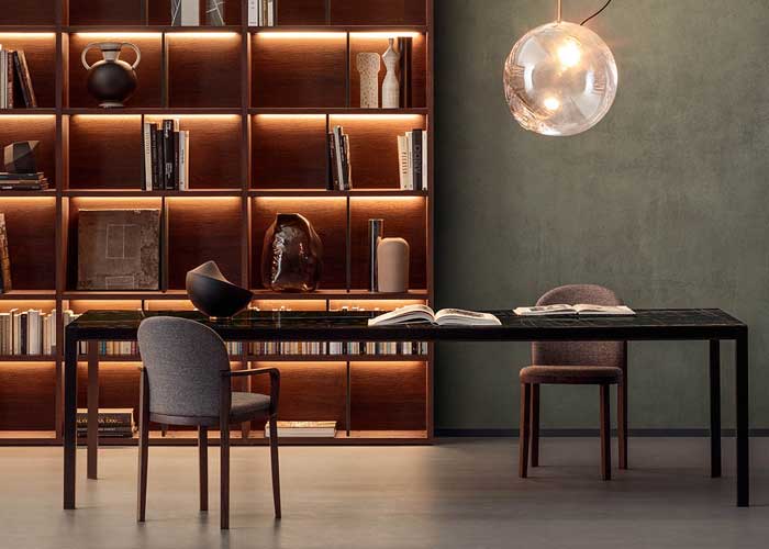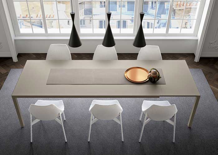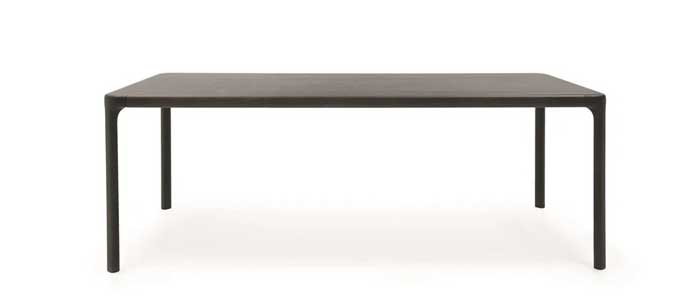 Ligera, esencial, inteligente: Soffio se moldea con un toque sutil y una versatilidad ingeniosa. Su estructura, fabricada en aluminio pintado en cualquiera de los 20 colores de la colección, presenta volúmenes mínimos bien diseñados. Las patas de sección triangular forman esquinas con una nitidez similar a la de un diamante y sostienen la superficie en acabado mate lacado en madera. Viene en 5 anchos, mientras que las longitudes se pueden hacer a medida: hasta 3 metros para la versión fija y un total de 3,6 metros para la versión extensible.