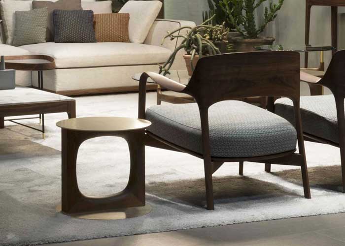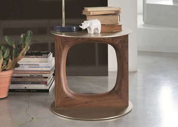 Mesa auxiliar con soporte central de nogal canaletta macizo y tapa y base en metal en acabado latón cepillado.