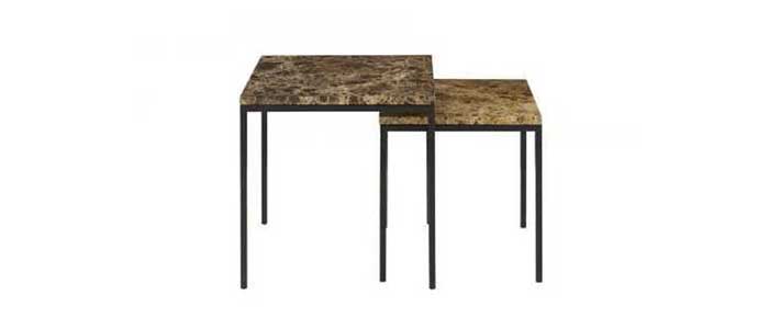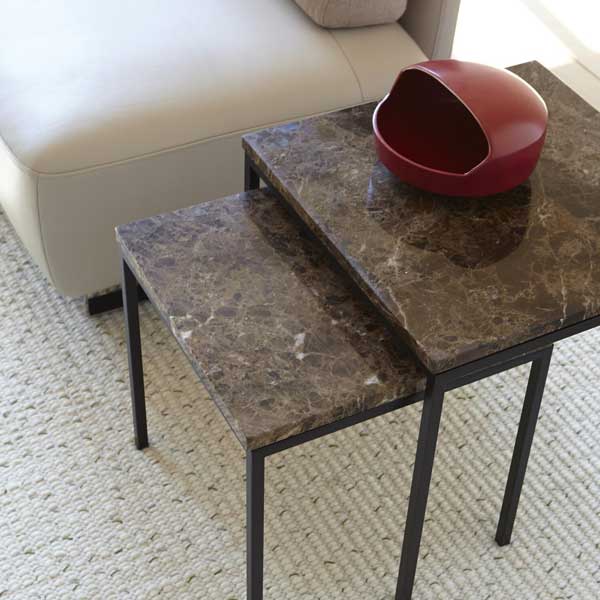 Encimera (38 x 38 x 2 cm de espesor o 45 x 45 x 2 cm de espesor) de mármol color LATTE (brecha maritima) o VERDE (Indian Green) o CORSÉ (Marron emperador), pulido brillo con tratamiento antimanchas. Estructura en acero lacado negro satinado con deslizadores negros.