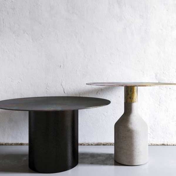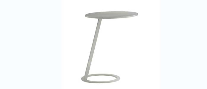 Velador con encimera y travesaños lacados en nero o blanco, o con travesaños cromados brillante y con encimera de inox brillante, o con pata cromada brillante y encimera lacada de aluminio barnizado. Puede ser utilizado como terminación de sofá o mesilla.
