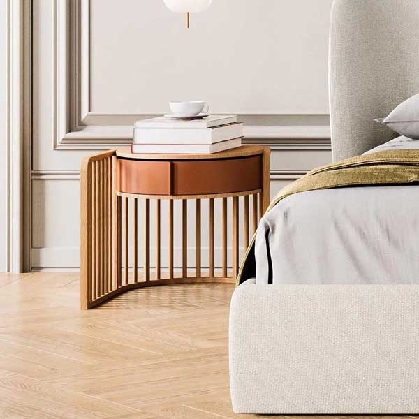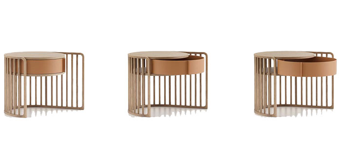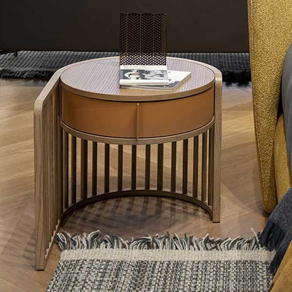 Palù diseñada por Raffaella Mangiarotti para Pianca es una mesita de noche realizada con estructura en nogal Canaletto macizo o fresno teñido. Cajón revestido en cuero regenerado con decoración en latón pulido.