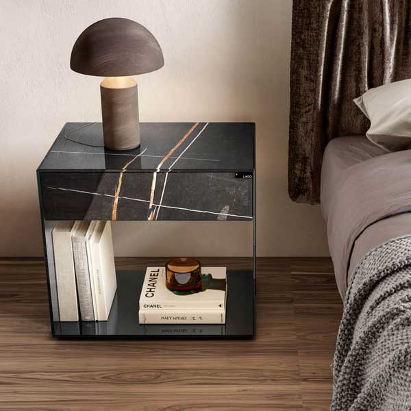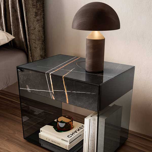 La estructura rigurosa de las mesitas de noche Up- Glass resulta aligerada por las transparencias del cristal extraclaro, fumé gris o fumé bronce. Soluciones de almacenamiento personalizables con las infinitas texturas matéricas de XGlass, liberadas de cualquier anclaje a pared para ofrecer la máxima facilidad de desplazamiento y personalización de la zona noche.