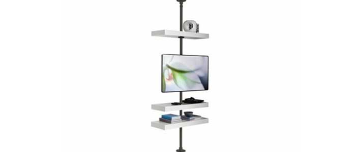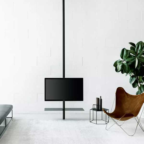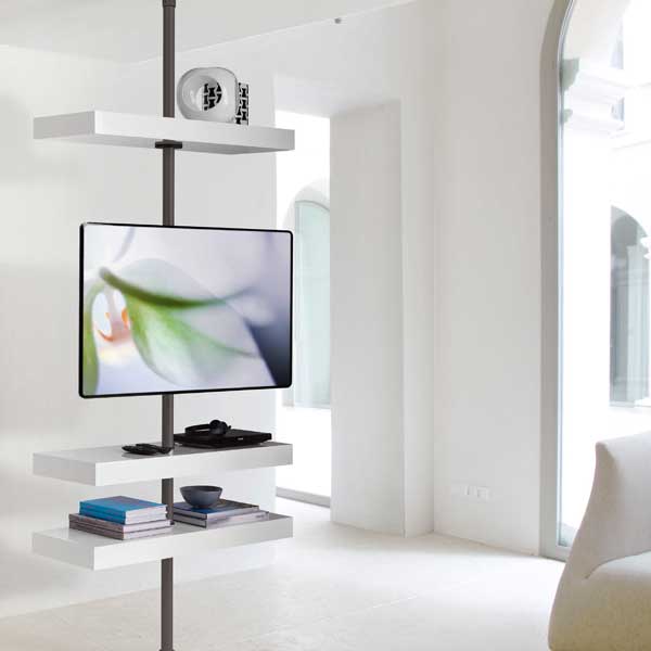 Columna en metal fijada a la pared o al techo. Los contenedores en madera o cristal son fijados a la columna mediante anillos de rotación para que puedan girar completamente. Placa de metal (con o sin estante) para pantalla de plasma. En la parte posterior hay 8 agujeros para permitir que los cables pasen travéò de la columna.