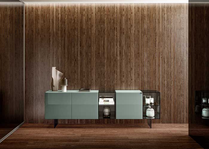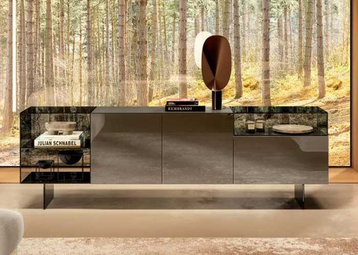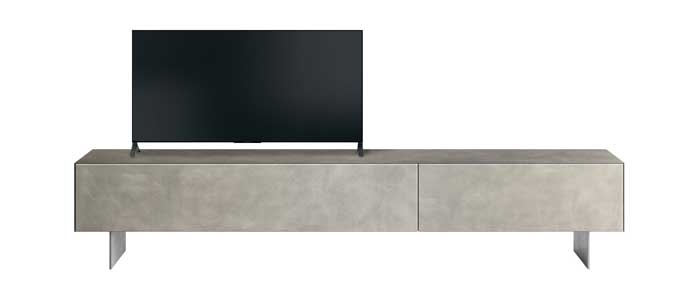 La limpieza formal del Mueble TV Materia vuelve el producto armonioso con cualquier estilo de interiorismo, haciendo revivir en este sólido las emociones del cristal. Las infinitas posibilidades de personalización de las superficies, gracias a la fuerza innovadora de XGlass y a la continuidad de las vetas del mármol y la madera entre laterales, encimera y puerta, regalan un toque de elegancia a la zona sala de estar. Materia puede estar suspendido sobre apoyos de metal en Titanio steel o Peltro steel, o fijado la pared.