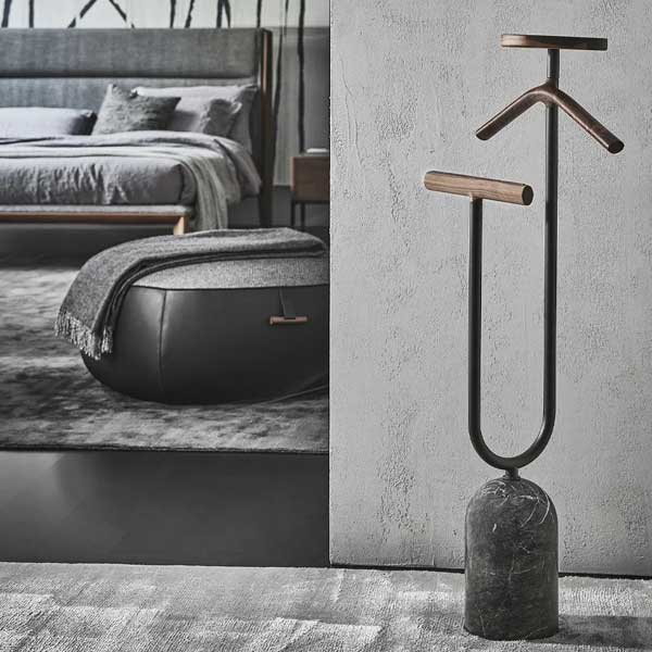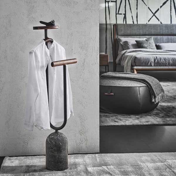 cilindrica en mármol blanco Carrara o gris Carnico y estructura en metal acabado peltre. Percha porta pantalones con inserto antideslizante en microfibra gris y bandeja porta objetos revestida de Cuoietto.