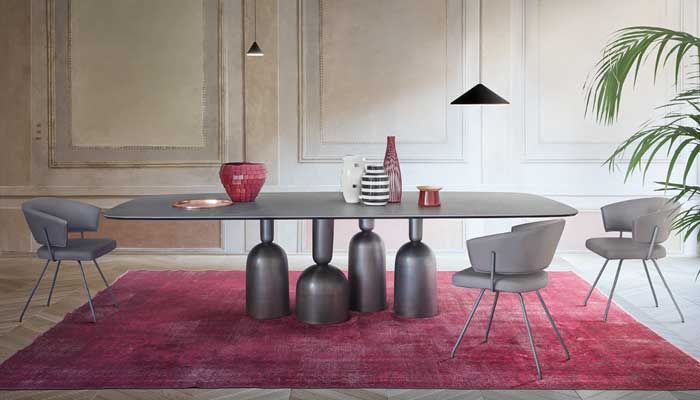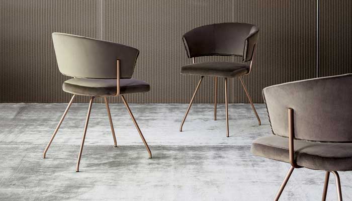Light graphic marks characterize the Bahia chair designed by Mauro Lipparini. Curved shapes and simple tubular metal elements create a balanced shape, which is ideal both in residential settings and in smart contract environments (such as offices, waiting rooms, hotel lobbies). The curved backrest extends forward in a single line, allowing the arms to rest freely while enveloping the user’s back for maximum comfort. Frame in painted metal, chrome, copper or matt brass finish.