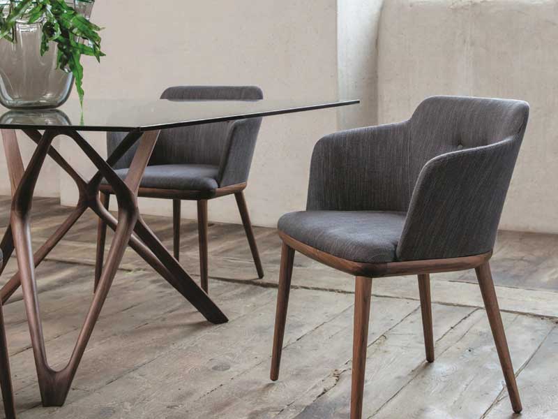 La silla con brazos destaca por su diseño equilibrado que combina líneas contemporáneas y acabados artesanales de alta calidad. Su estructura está fabricada en madera maciza, disponible en las elegantes versiones de nogal canaletta o fresno, cada una con una gama de acabados que realzan la belleza natural de la madera, desde tonos cálidos y naturales hasta opciones teñidas que aportan un toque moderno y sofisticado.