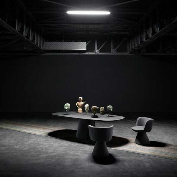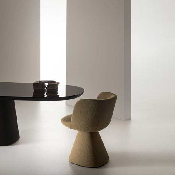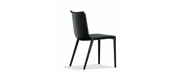 Charlotte de Antonio Citterio es un homenaje a la ligereza. La carcasa está completamente cubierta, pero el perfil del marco es visible en el lado de la silla, lo que resalta la línea del asiento. La funda es de piel plena flor cortada en bruto en diferentes colores. El marco está disponible en una serie de diferentes acabados que lo enfatizan o lo mezclan.