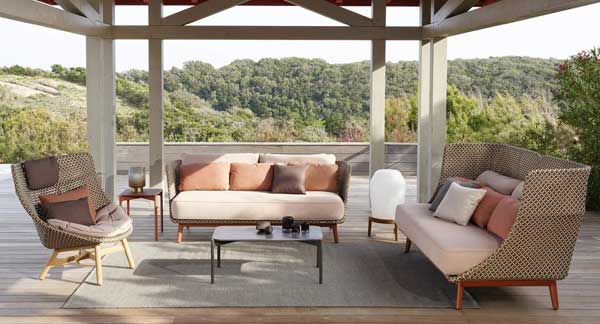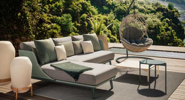 Con sus amplios respaldos y asientos profundos, MBARQ de Sebastian Herkner envuelve a los usuarios en privacidad y confort protector. Inspirada en la forma tradicional del rincón interior, la colección modular da estructura a los espacios exteriores abiertos, definiendo áreas para trabajar, descansar o entablar conversación.
