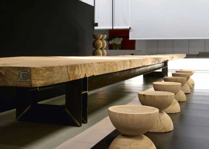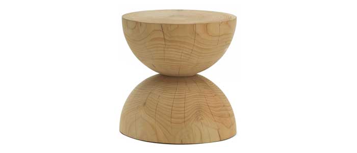 Taburete hecho de un solo bloque de cedro perfumado que presenta dos semicírculos colocados uno encima del otro para formar un reloj de arena.