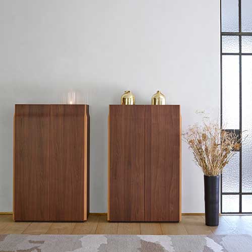 La colección se presenta en combinación de madera maciza de nogal oscuro con madera de cerezo en barnizado natural. Un refinado contraste que hace de Utopía una colección sobria y elegante.